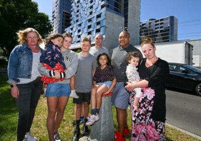 Alison Bacon, far right, with her family and other residents near the corner of Plummer and Prohasky Streets in Fishermans Bend. Credit:Joe Armao