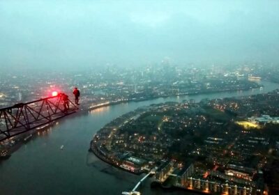 THIS is the heart-stopping moment two idiots climb a 784ft skyscraper near Canary Wharf without safety rope, risking plunging to their deaths.