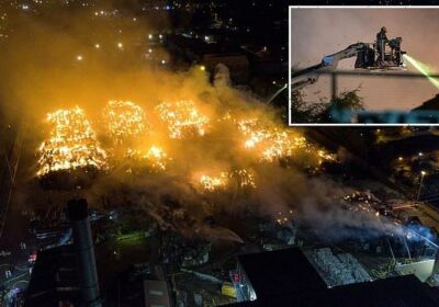 Huge inferno erupts at recycling compound sparking warnings to ‘keep windows and doors closed’ as more than 100 firefighters battle the blaze