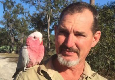 He spotted Crackers the galah – a species of cockatoo – sitting on the ground and tried to use an aluminium mop and then a wooden broom to move him along.