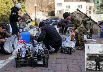 Volunteers pictured preparing molotov cocktails ik Kyiv, Ukraine, on Saturday as fierce fighting continues