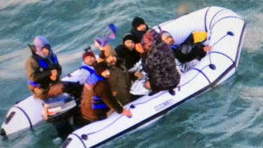 Migrants aboard a rubber boat after being intercepted by French authorities off the port of Calais in northern France.Credit:AP