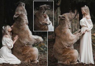 Beauty and the beast: Model poses with deadly grizzly bear but she’s perfectly safe… because he’s been raised as a vegetarian since he was adopted as a cub