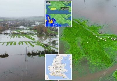 Britons must brace themselves for more bad weather as nearly 60 flood alerts have been issued in England along with a yellow weather warning for the southeast – as sheep were seen stranded on raised ground after a river dramatically burst its banks.
