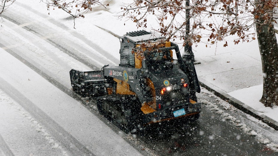 A snow clearing machine cleans a road during heavy snow, Saturday, Dec. 5, 2020, in Marlborough, Mass.