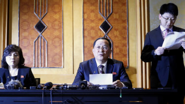 Ri Yong-Ho, North Korea’s Foreign Minister, centre, speaks as Choe Son Hui, North Korea’s Vice Foreign Minister, left, listens during a during a news conference following the Hanoi Summit.Credit:Bloomberg