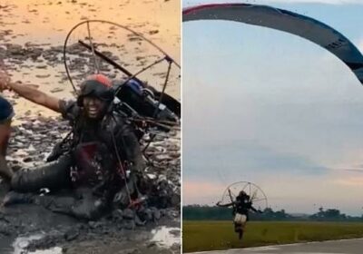 A flying enthusiast’s attempt to take to the air using a motorised paraglider ended almost quickly as it began in Nakhon Pathom province, Thailand