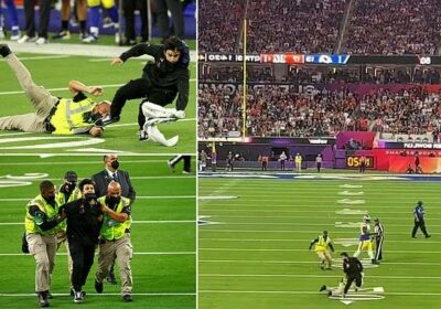 Holding a white flag and wearing an official Super Bowl LVI jacket, the man was able to race 80 yards down the field with three guards in his wake, before they were finally able to bring him to the ground and drag him away.